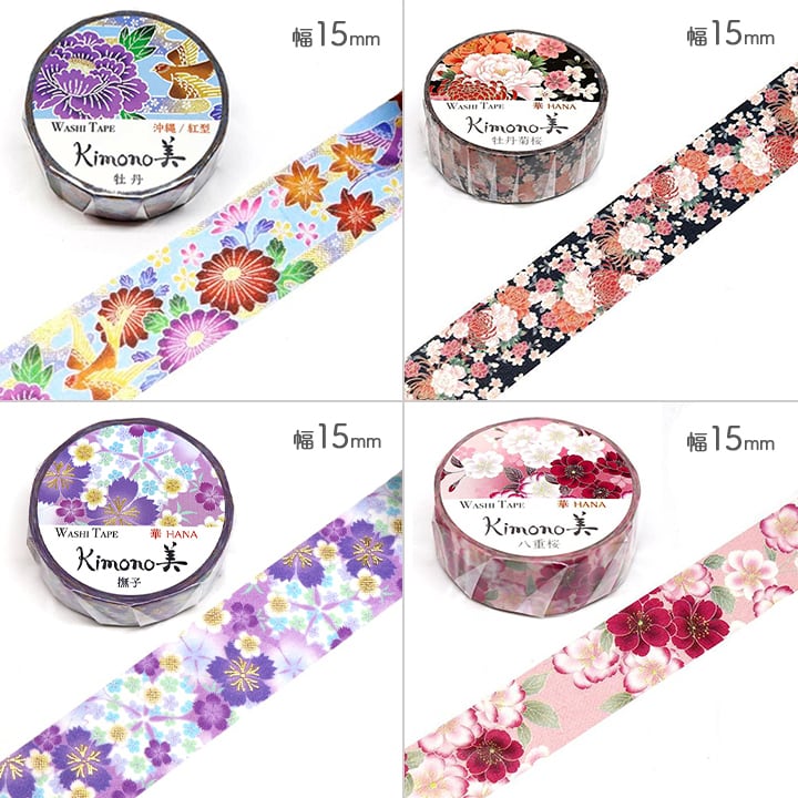 \10/31(金)までセール価格!/ 和紙マスキングテープ 15mm×7m 4巻Aセット 牡丹/牡丹菊桜/撫子/八重桜 kimono美シリーズ【送料無料】